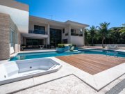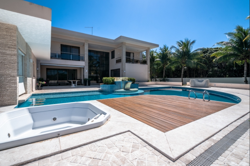 Área de lazer com piscina, deck de madeira e churrasqueira. Previsão de ar condicionado para as 4 suítes de cima. Aquecimento solar e 6 vagas cobertas.